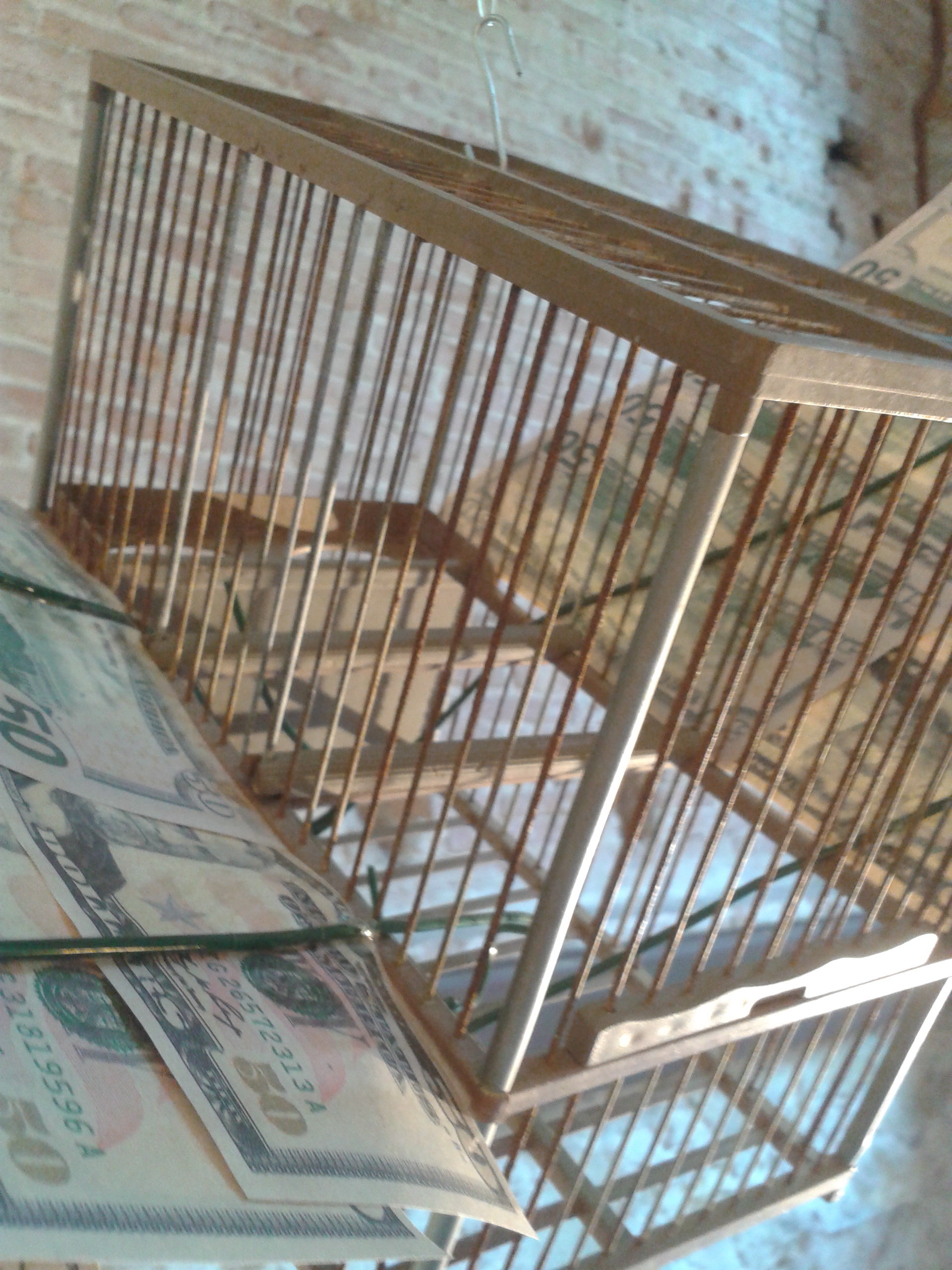 The money-winged cages (Icarus $ and Icarus €) enjoyed a brief stint in a window display in an upscale Barcelona boutique* before I was asked to take them down. The idea of money flying away, carrying with it nothing but a cage, was too much. “Too heavy”.
